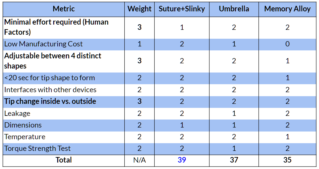 We used a weighted decision matrix with various metrics and design requirements to determine which concept to prototype further.