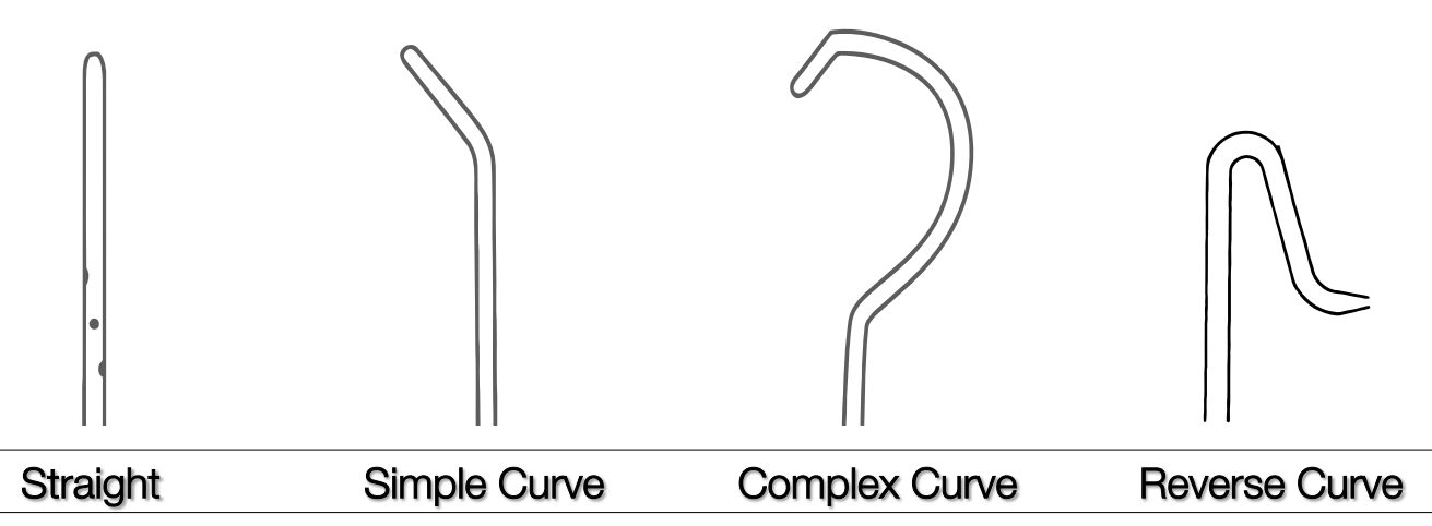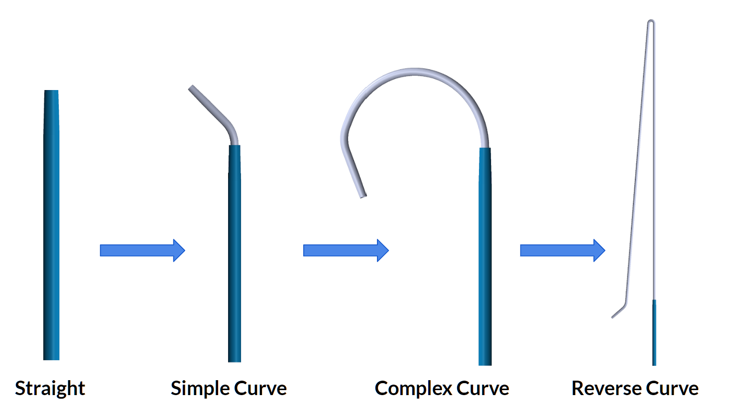 ✱ Adjustable Tip Shape: The tip of the catheter can be adjusted in real-time to form the most common catheter tip shapes used: Straight, simple curve, complex curve, and reverse curve.