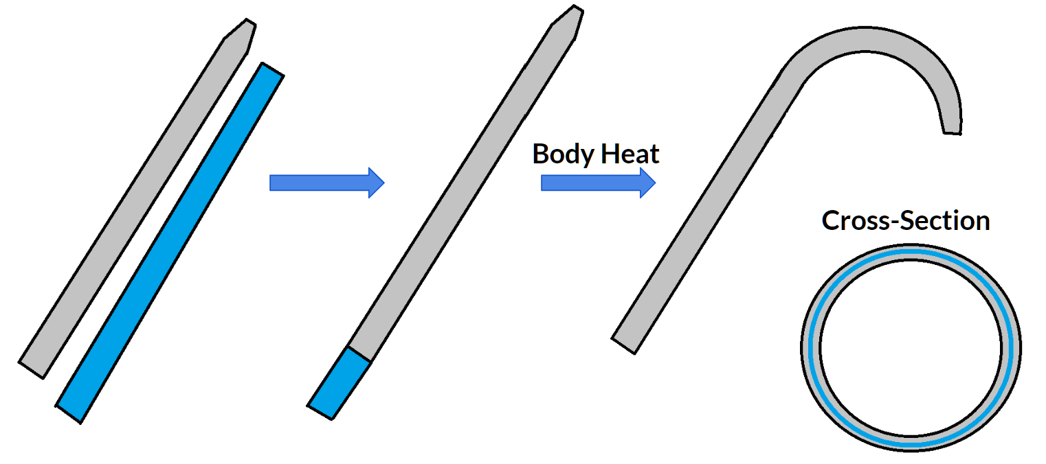 The catheter is embedded with a shape-memory alloy. When exposed to body temperature, it changes into and maintains a preset shape. However, this design only allows for a single premade shape. There would also be increased manufacturing costs and difficulties with storage and distribution.