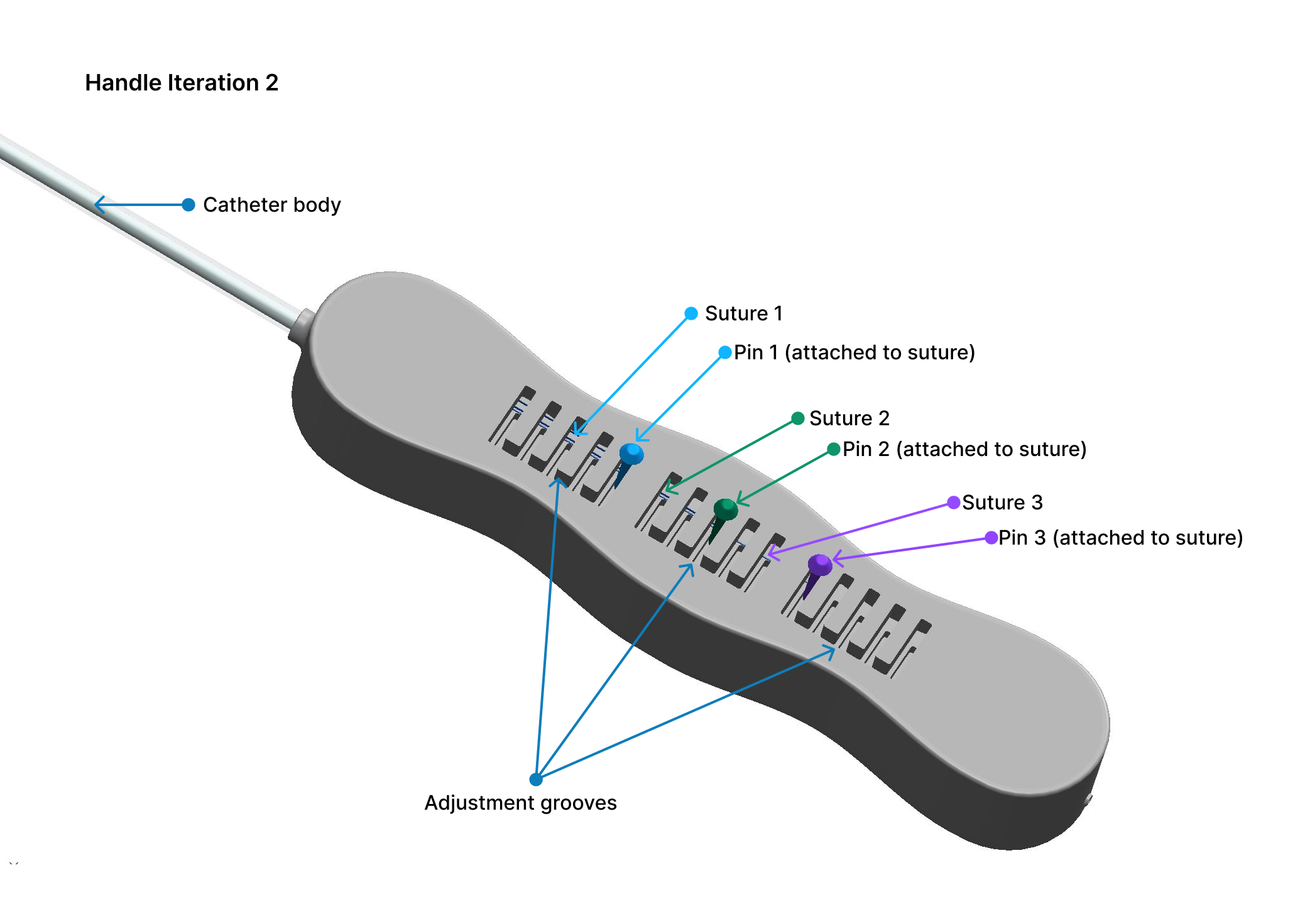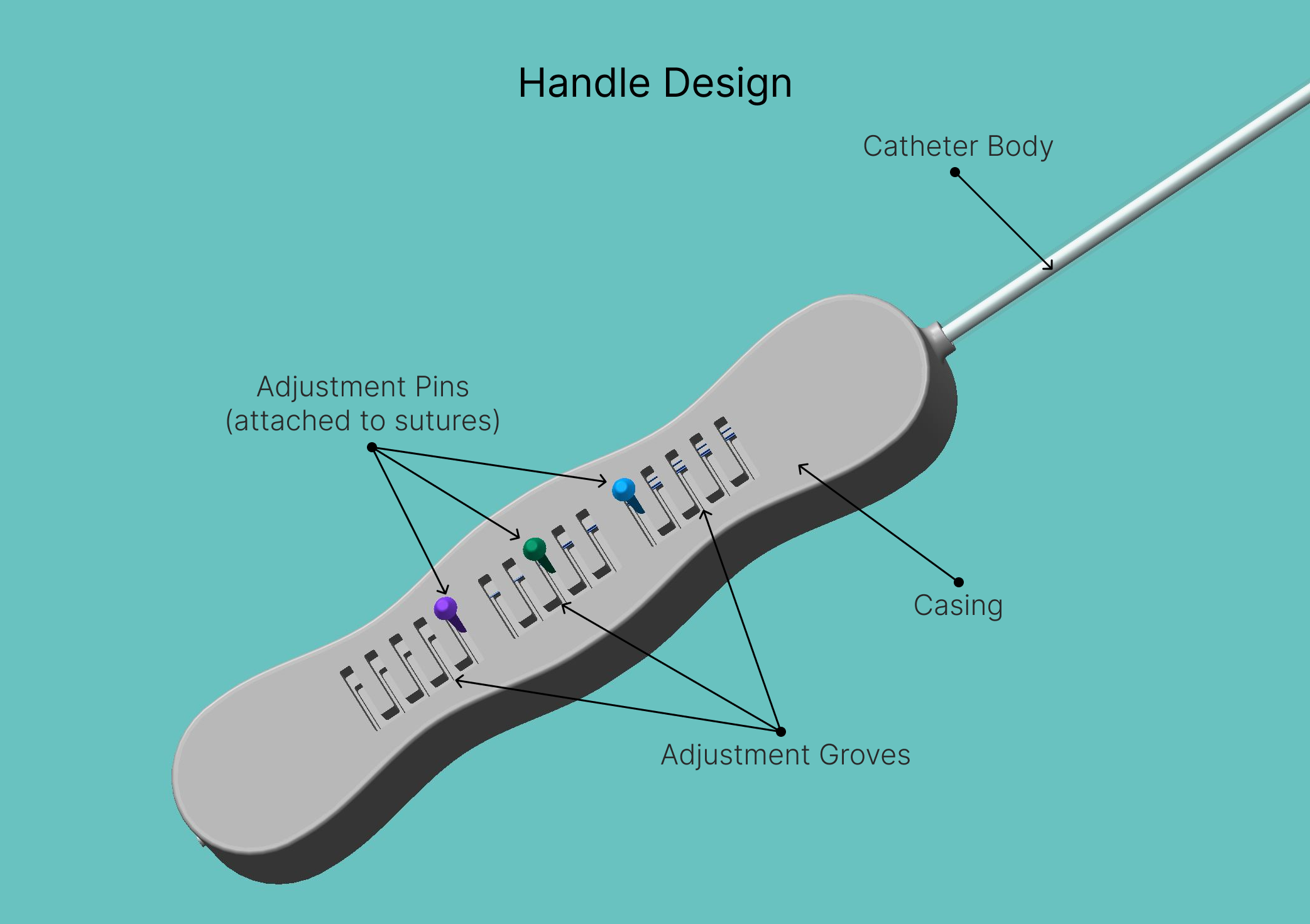 I designed the handle mechanism in SolidWorks and 3D printed prototypes. I iterated on the handle multiple times to refine the mechanism to adjust the catheter shape and to make the handle more comfortable to hold.