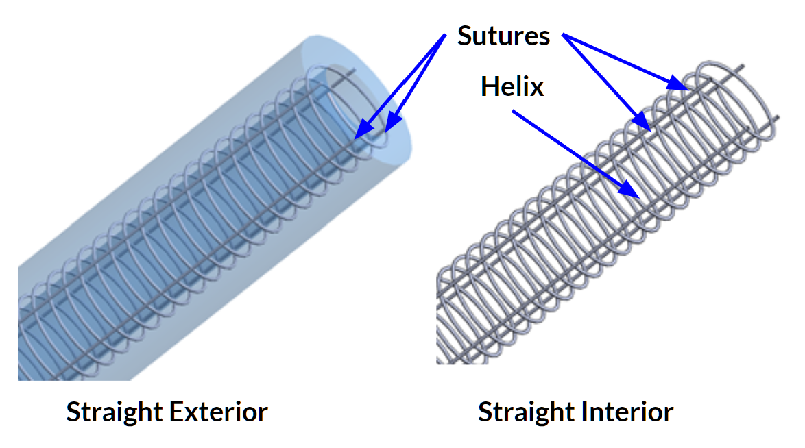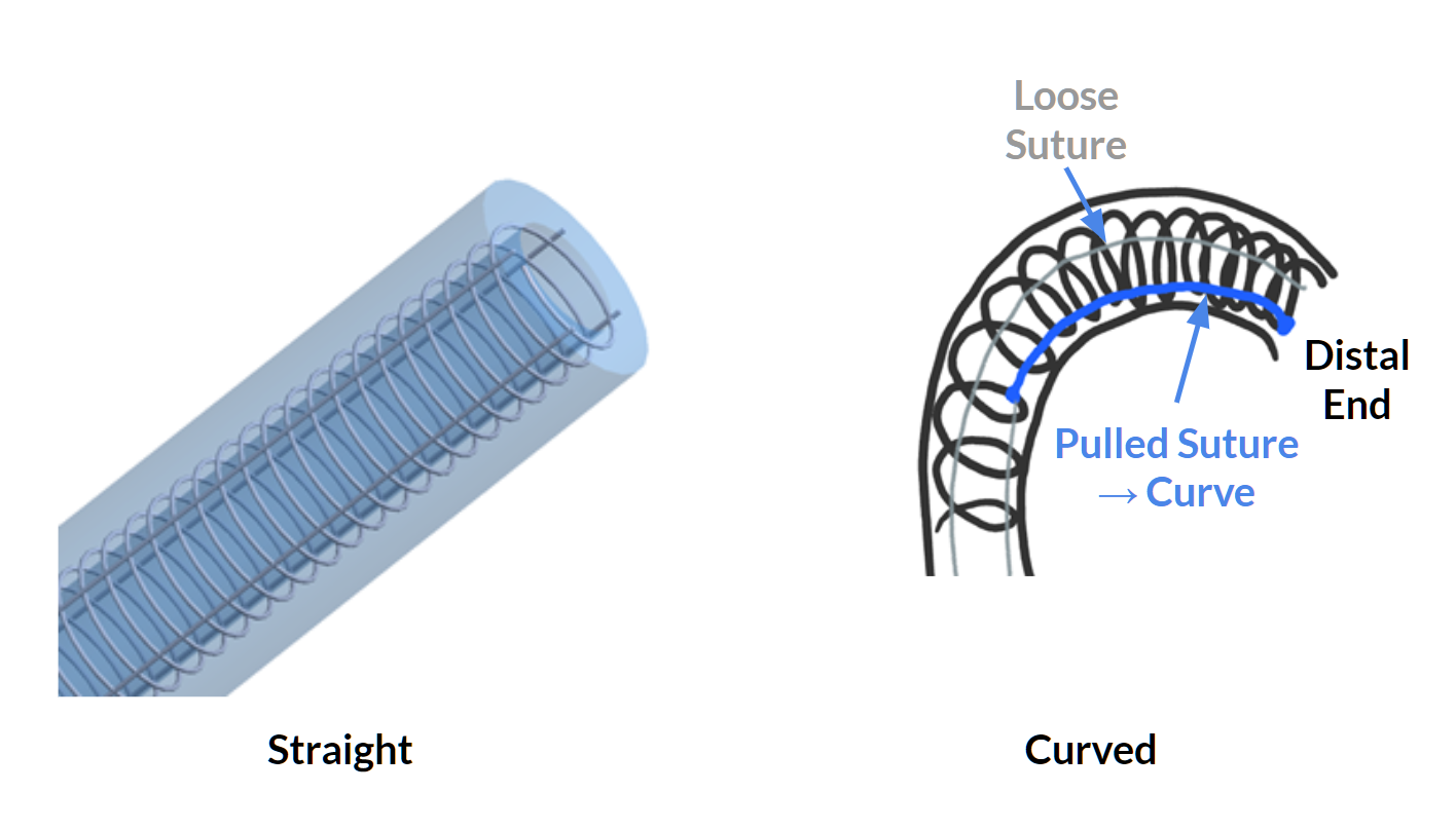 In this design, a coil is embedded inside of catheter walls. Sutures are attached to the coil, and run through the length of the catheter to the handle. When pulled, the coil compresses, changing the shape of the catheter. There are multiple coils located along the catheter to allow a multitude of shapes to form.
