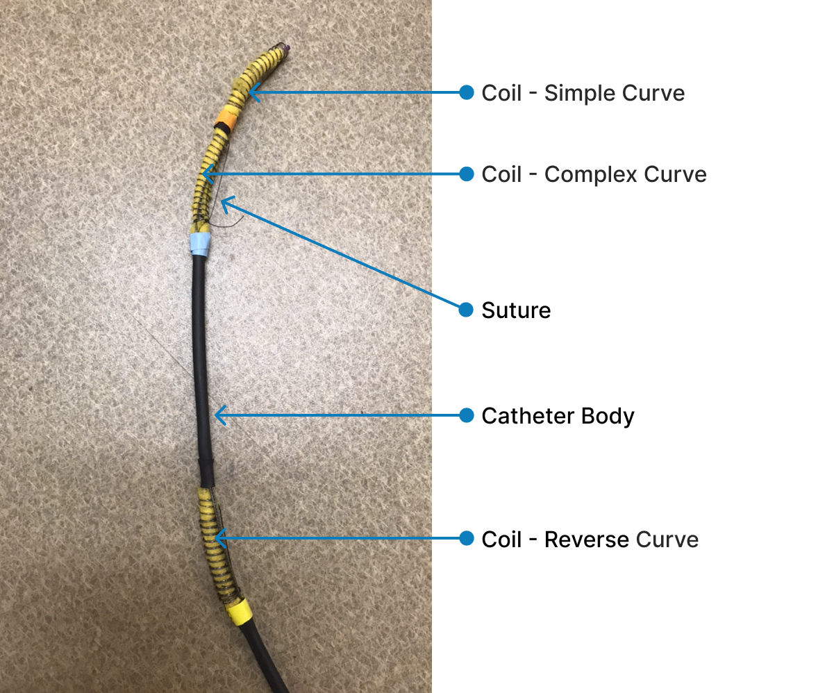 Metal coils are attached to the polyurethane catheter, with sutures attached to each coil.