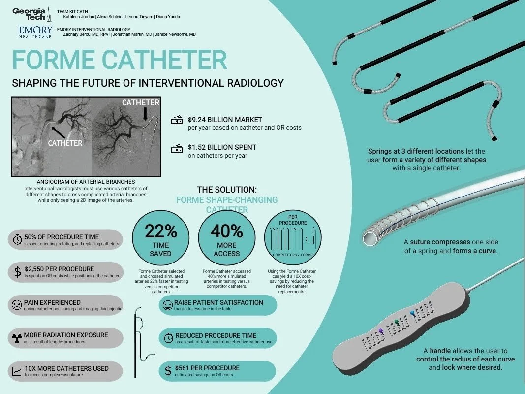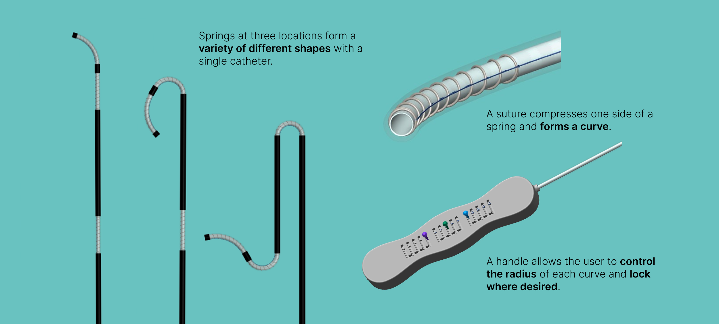 Forme catheter is a novel arterial catheter that can change shape in real-time in response to a patient’s unique vasculature. It contains embedded springs at three different locations that compress to form a variety of different shapes within a single catheter.
