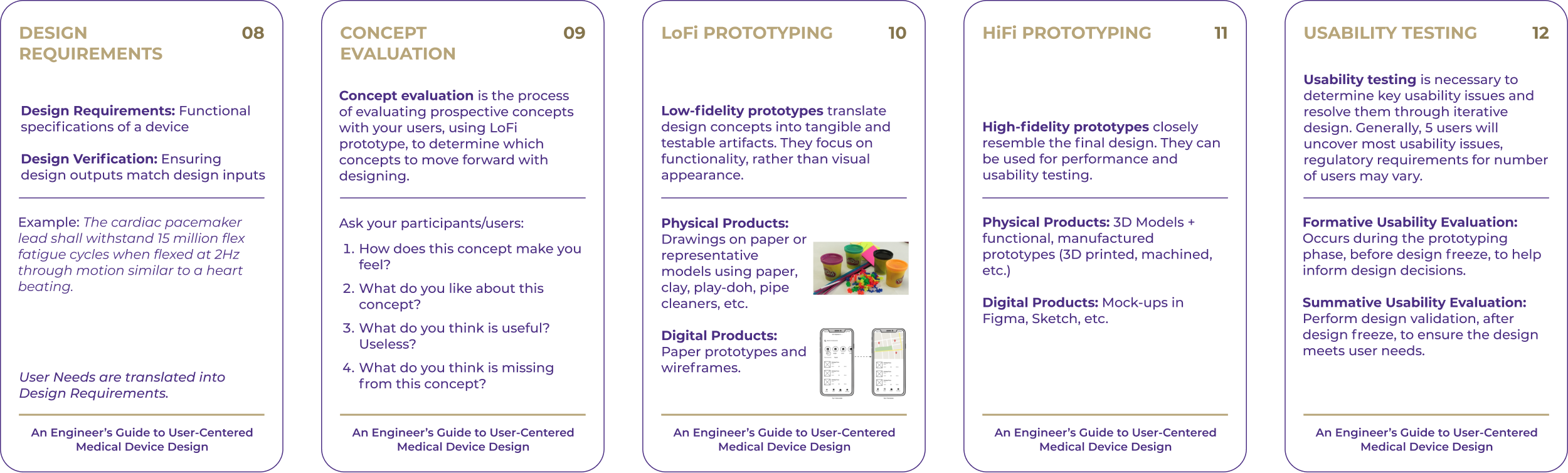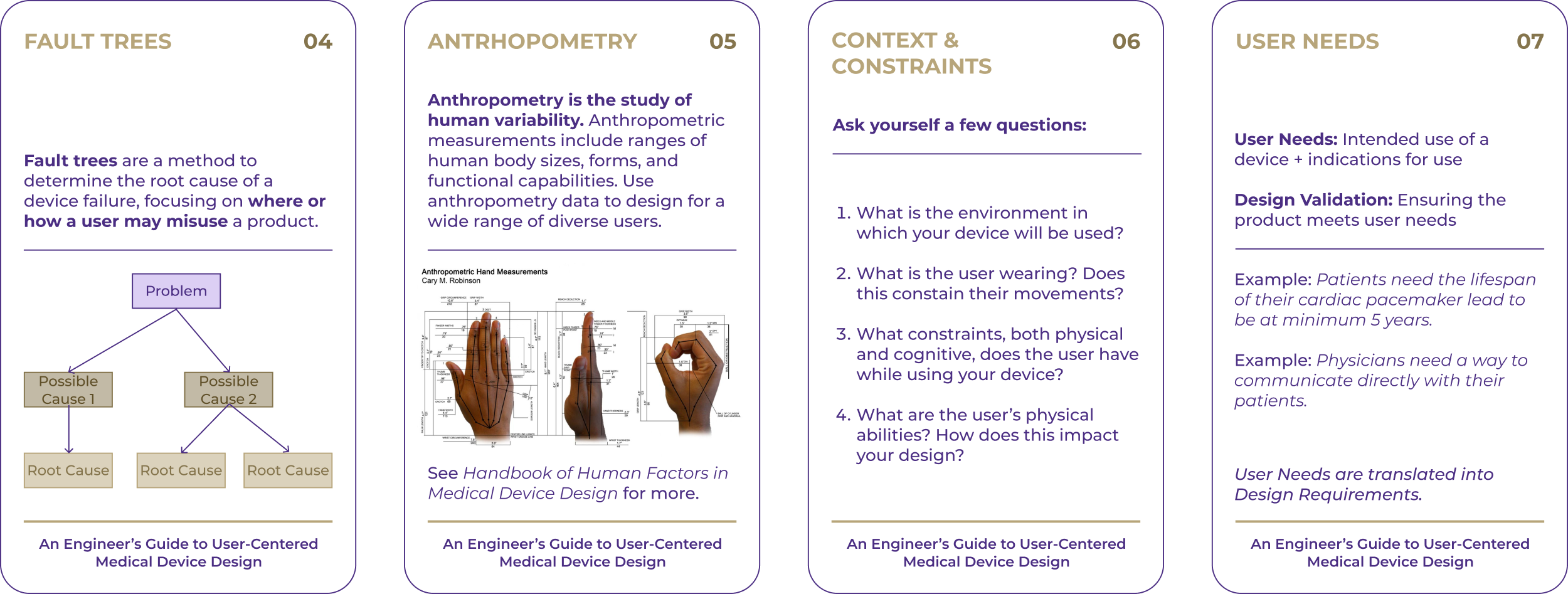 This guide is a set of cards for Mechanical R&D Engineers outlining common practices of user-centered medical device design.