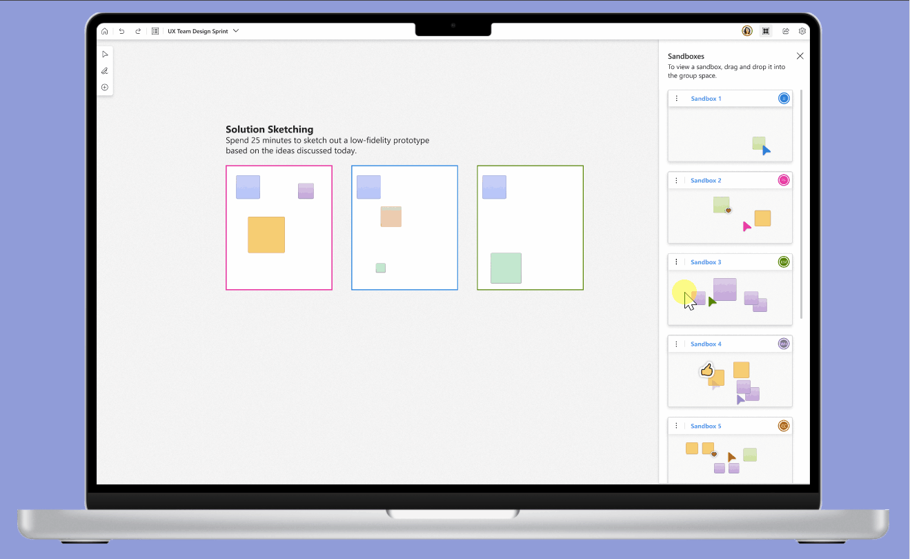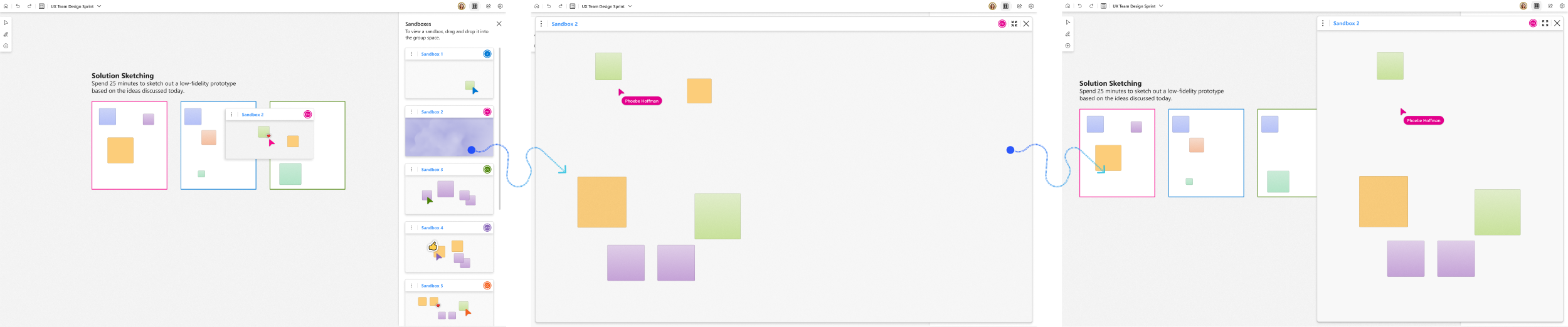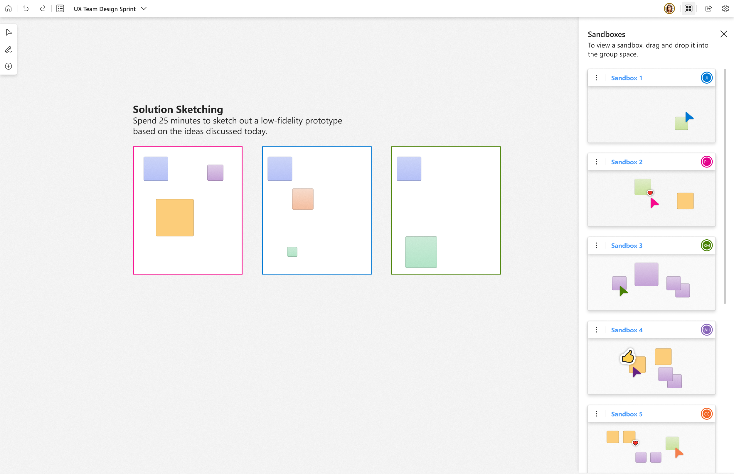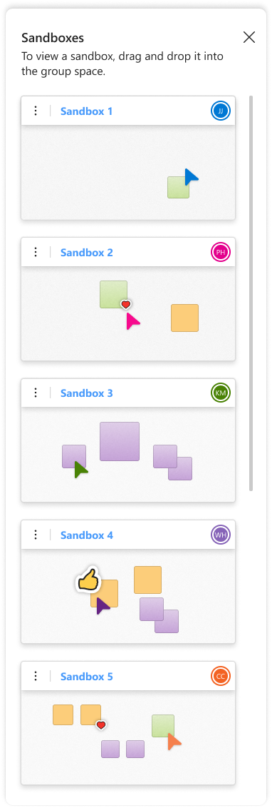 Sandboxes are breakout workspaces that the facilitator can create for certain types of activities or ideations where it is important for participants to have their own space and privacy to generate ideas. Sandboxes can be set up on the fly during a session. Similar to breakout rooms, there may be only one person in a Sandbox to brainstorm alone or a group of people in a Sandbox to brainstorm together. The goal of this feature is to provide a safe space for participants to work in cases when a large, open-canvas can be distracting, overwhelming, or counterproductive.