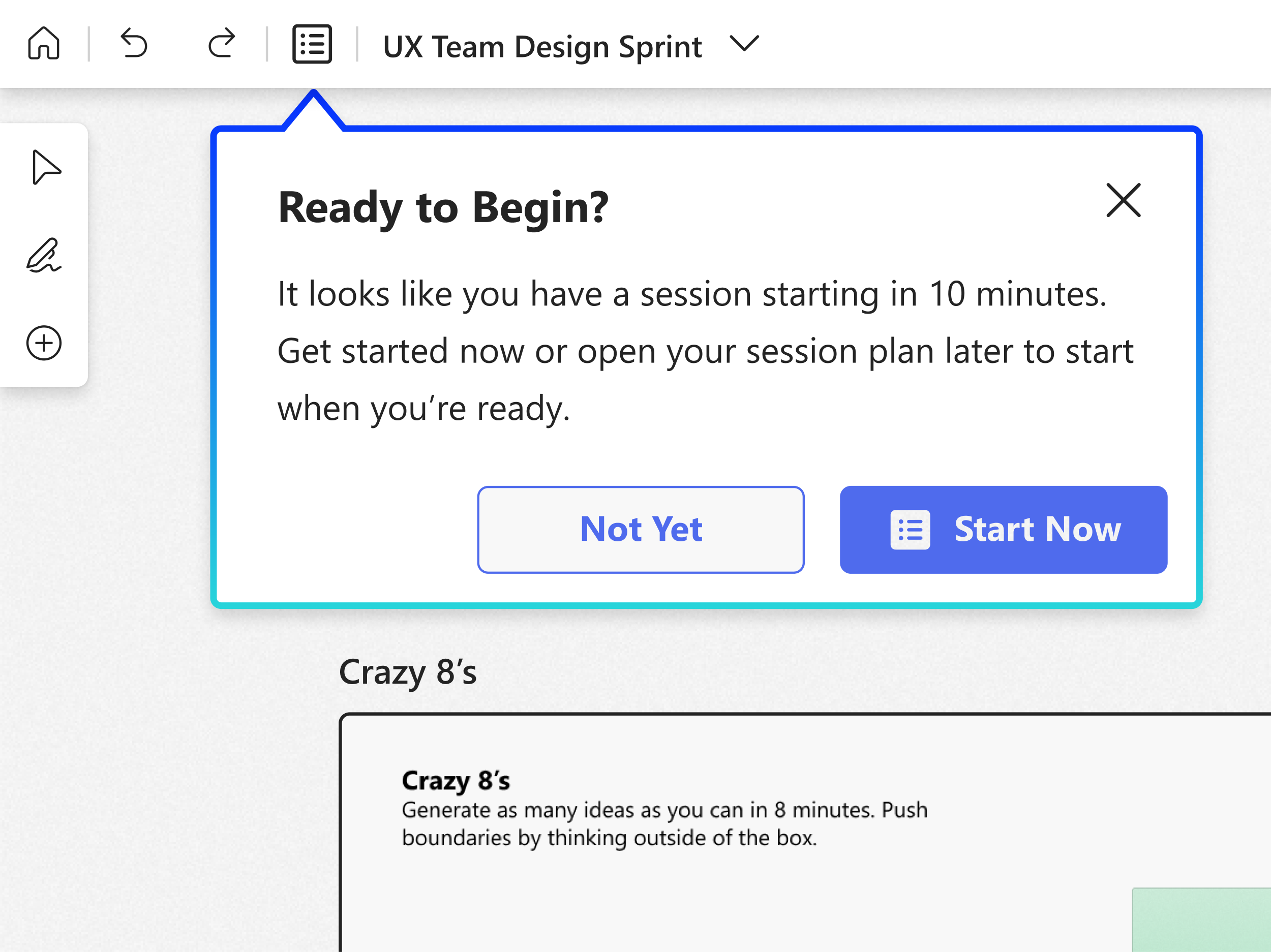 When the facilitator opens the brainstorming session Whiteboard, a notification pops up prompting them to start their session. The outline opens after “Start Now” is pressed. Shortly after, a second notification that explains Focus Mode pops up.
