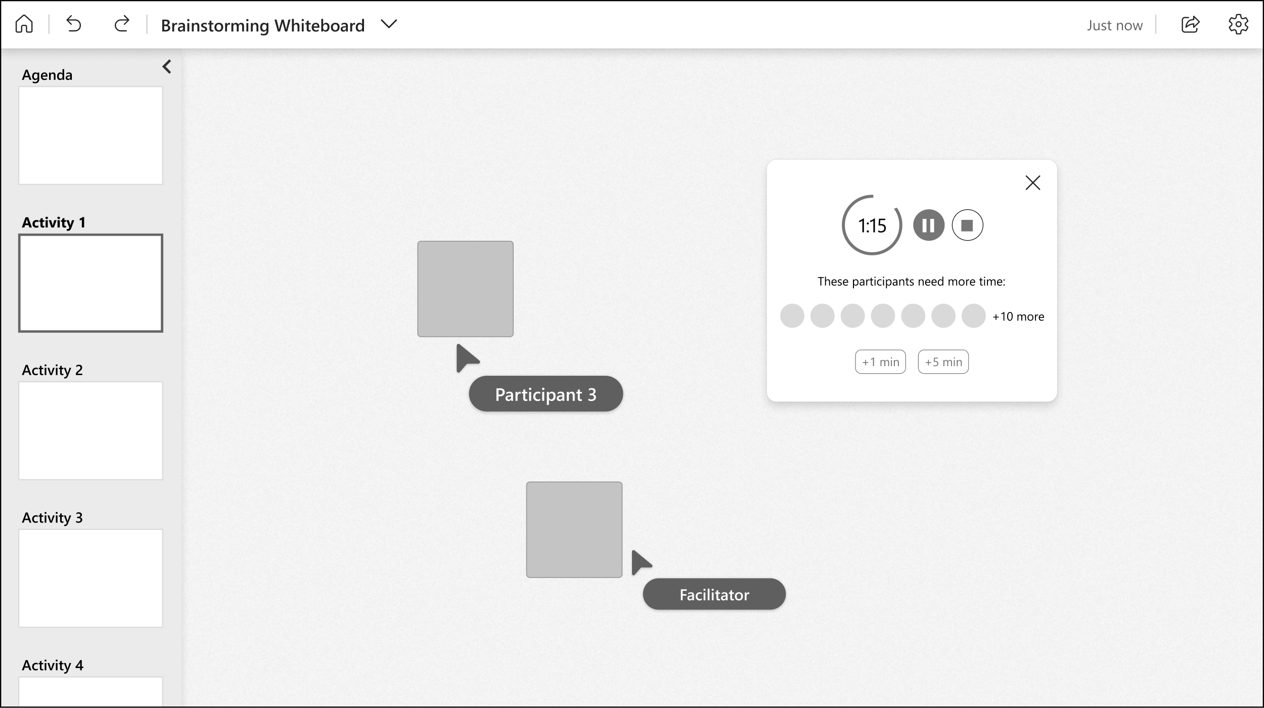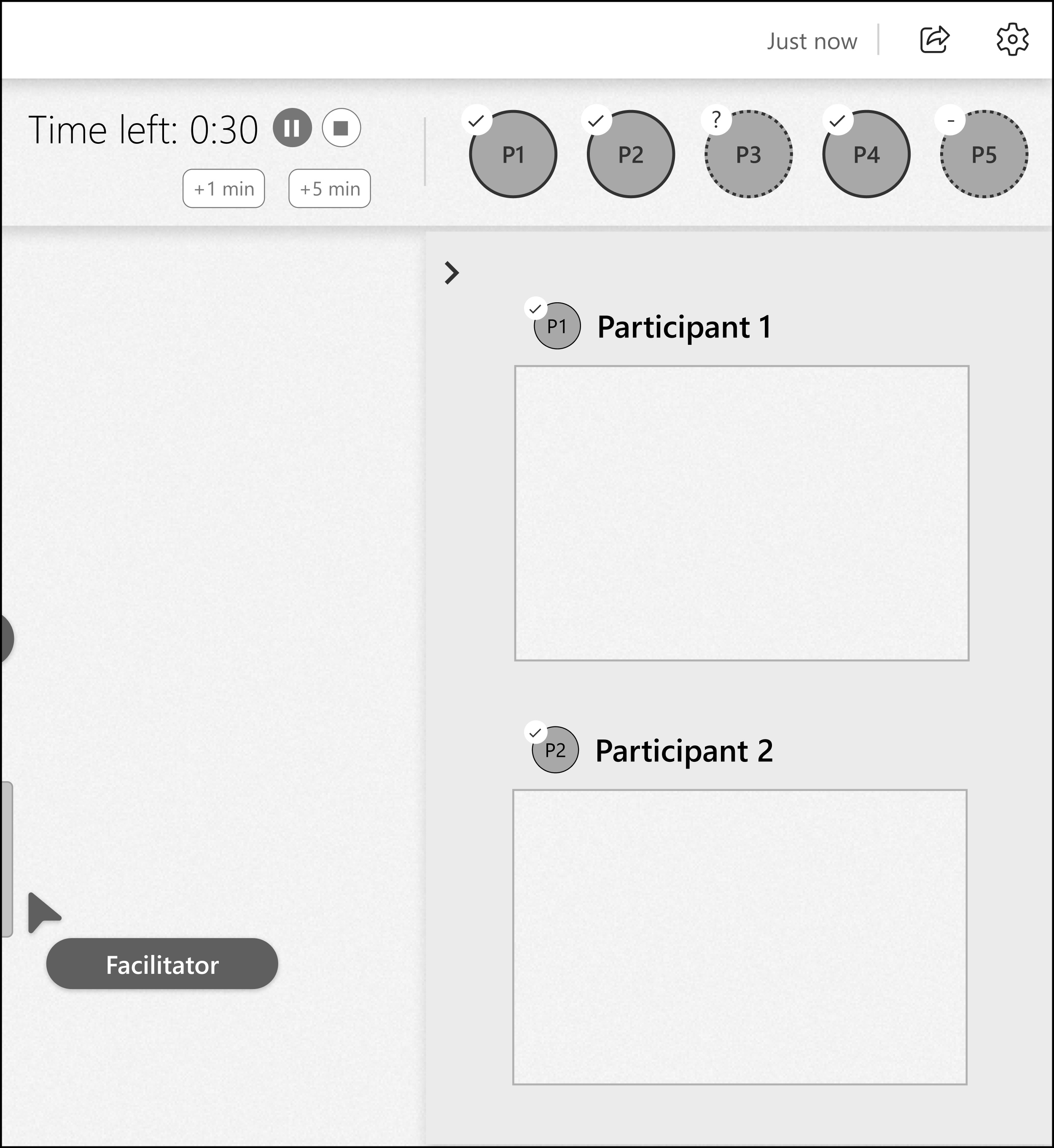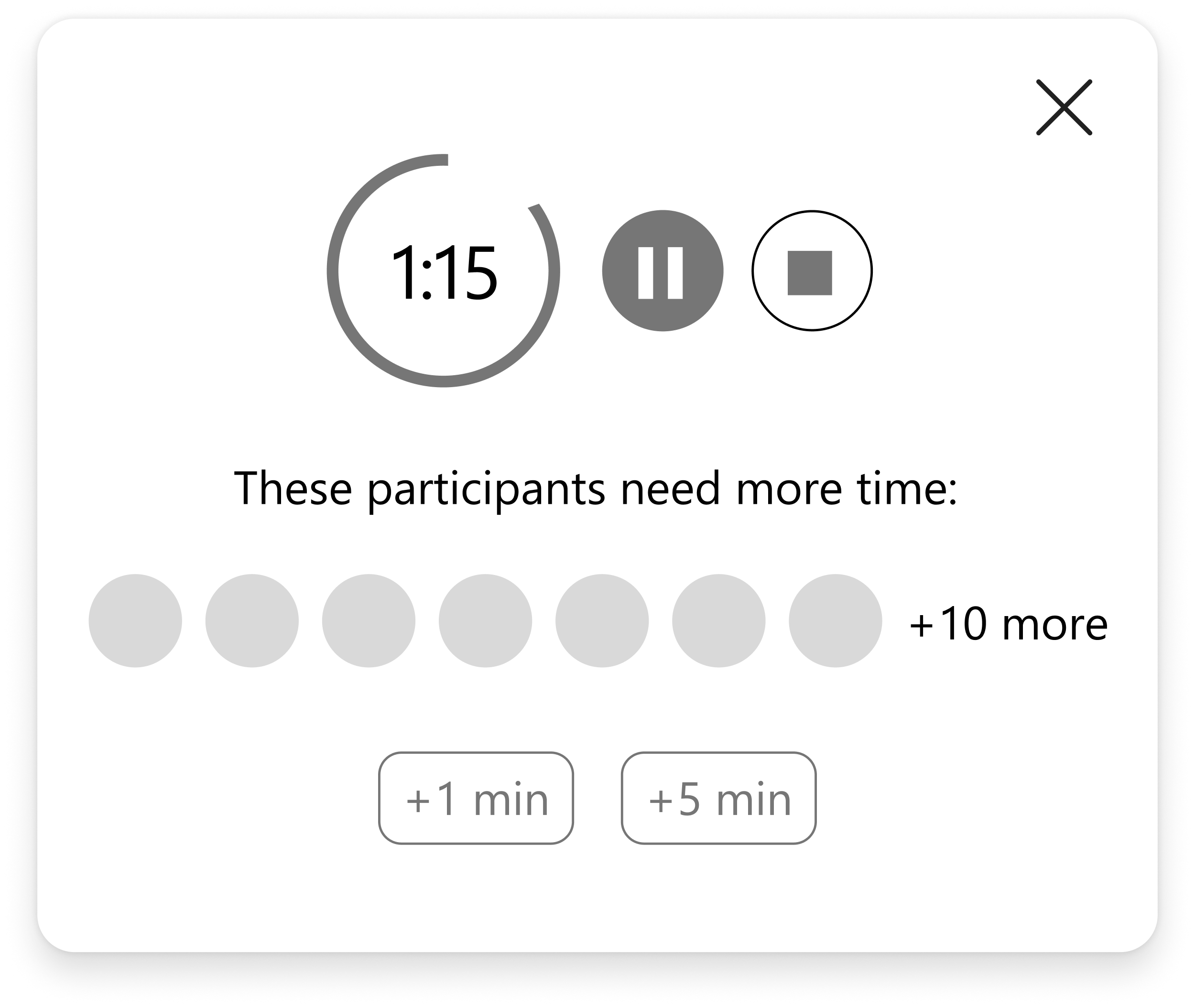 In this concept, the facilitator is able to see the status/progress of the participants in the whiteboard. In the first image, a small symbol on the upper left side of the participant’s Microsoft icon shows a check mark if the participant is done, and a question mark if the participant needs help. The second image shows a modal that indicates participants that have requested more time. This isn’t really helpful for a facilitator because they can’t stop a participant who isn’t engaged. The users we tested with felt that tracking doesn’t reduce barriers for participant engagement.