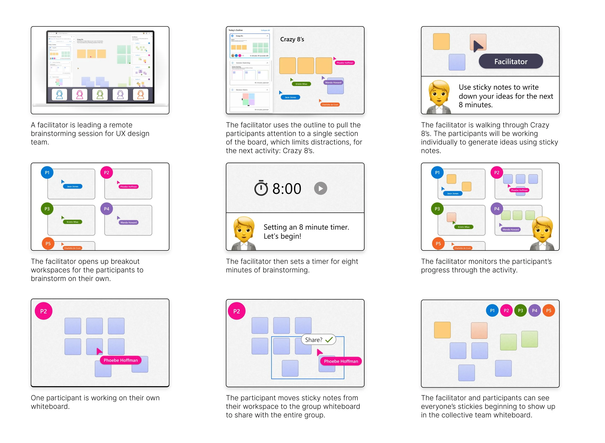 We further ideated on the outline and sandbox concepts, as we felt they were the most likely to help facilitators keep participants focused and engaged. We created storyboards to help illustrate the use case of concepts further designing. Shown here is the storyboard that illustrates the use case of our final solution.