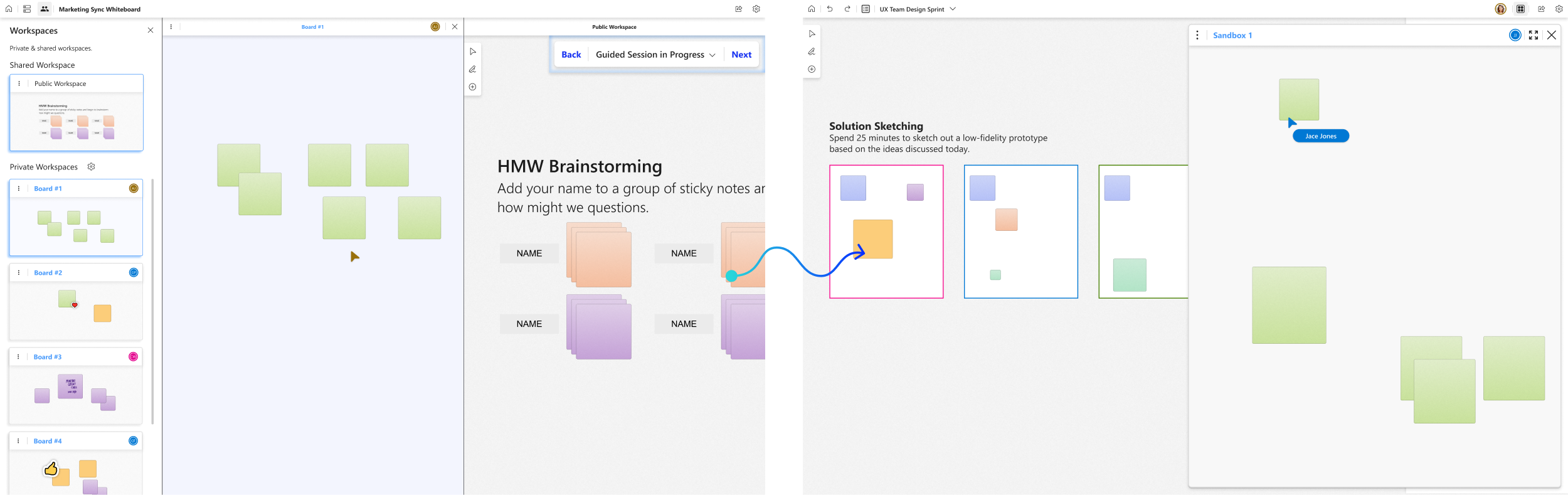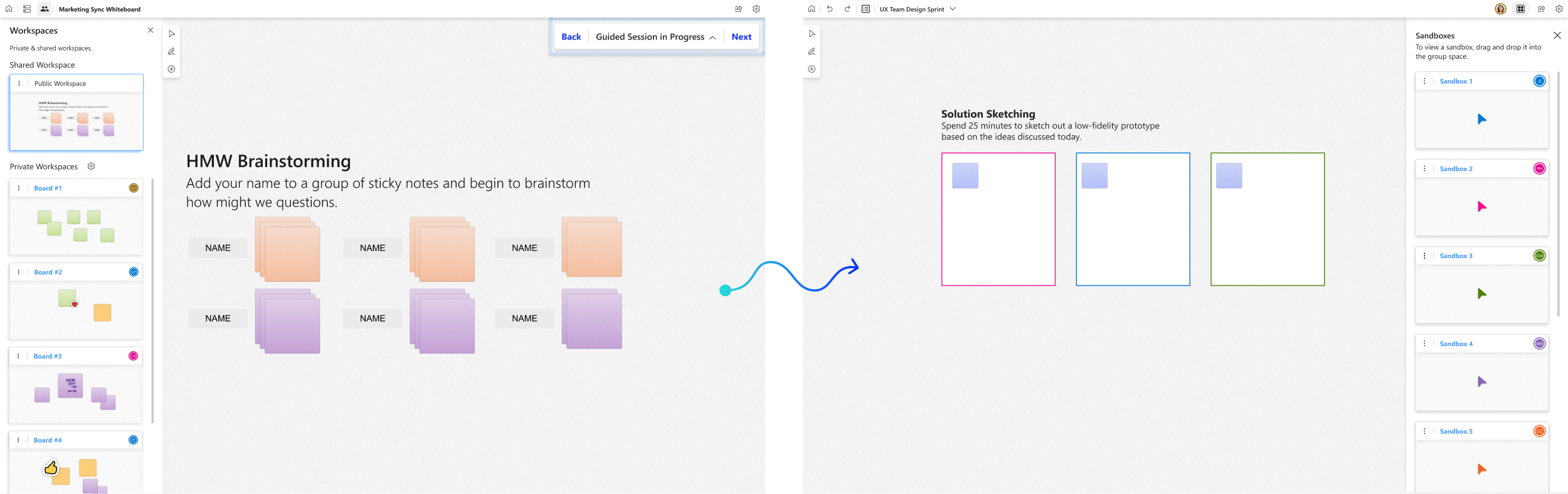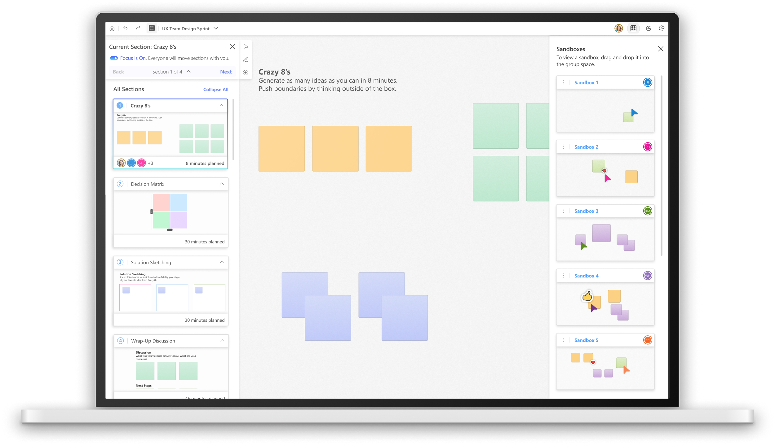 We created two new features, Focus Mode and Sandboxes, in Microsoft Whiteboard for facilitators to improve engagement and foster inclusivity for effective brainstorming sessions.