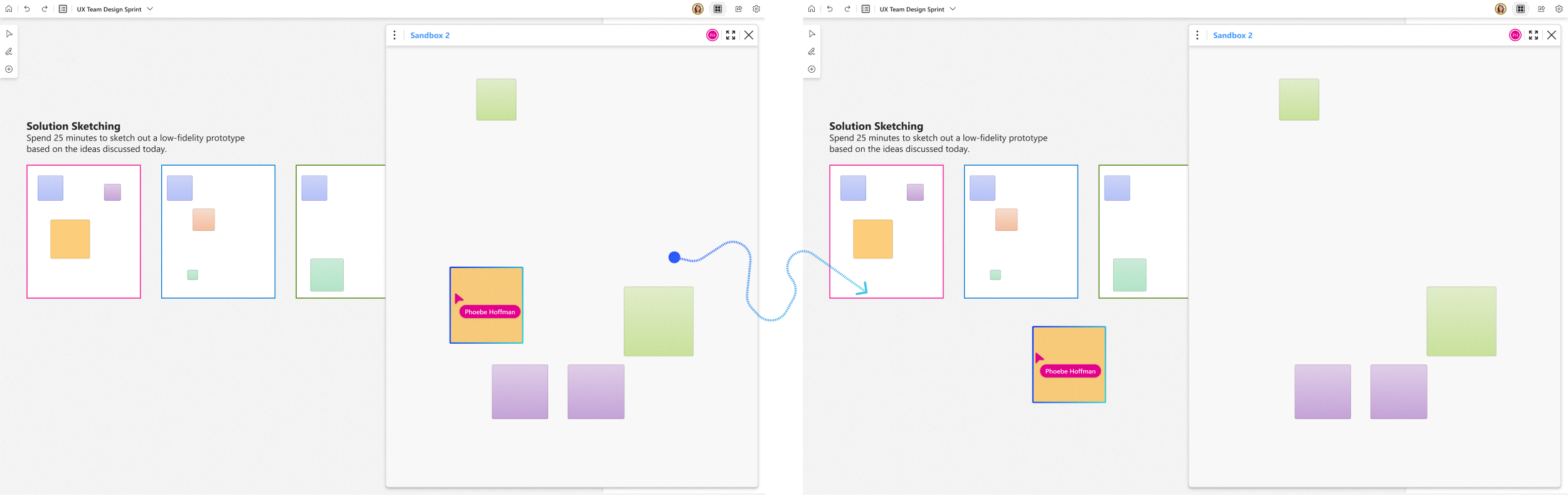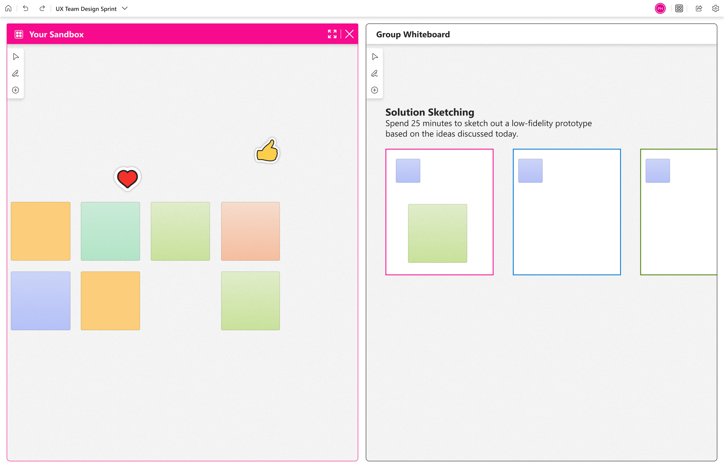 We provided flexibility to allow the facilitator to easily drag and drop a Sandbox onto the screen, maximize it or place it in split-screen, and drag items from the Sandbox to the shared board.