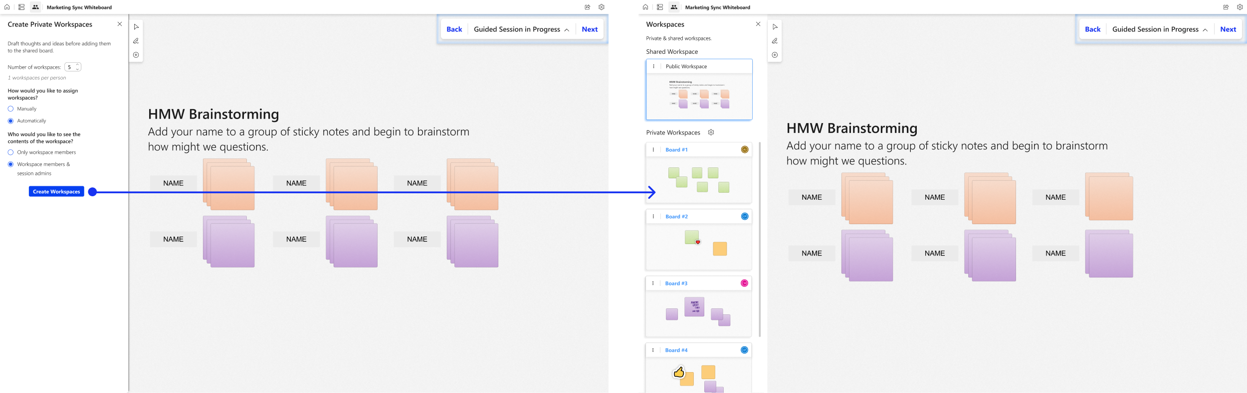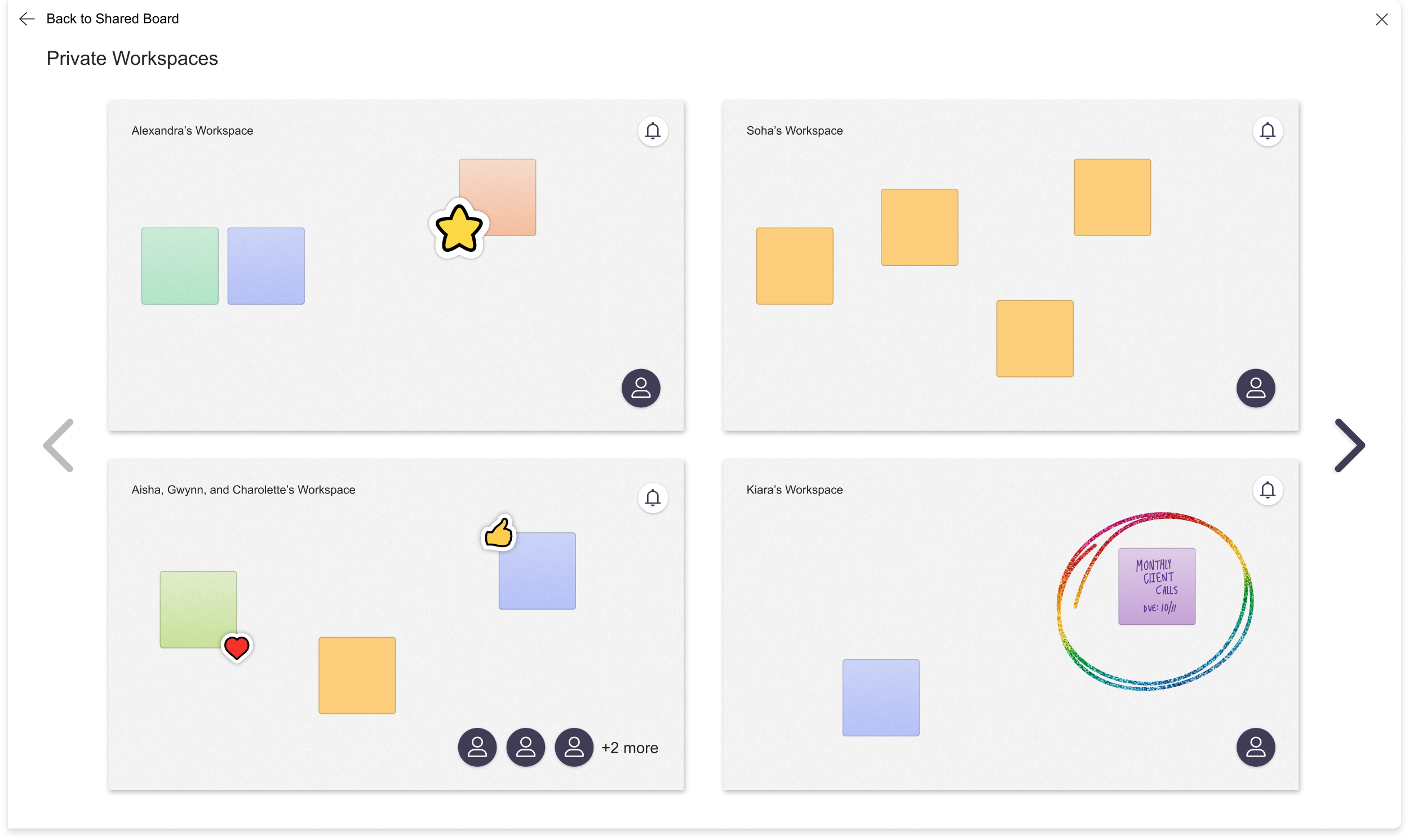 Private Workspaces: Provide participants a private workspace where they ideate separately from the main session whiteboard. These private workspaces would function similarly to breakout rooms in Zoom.