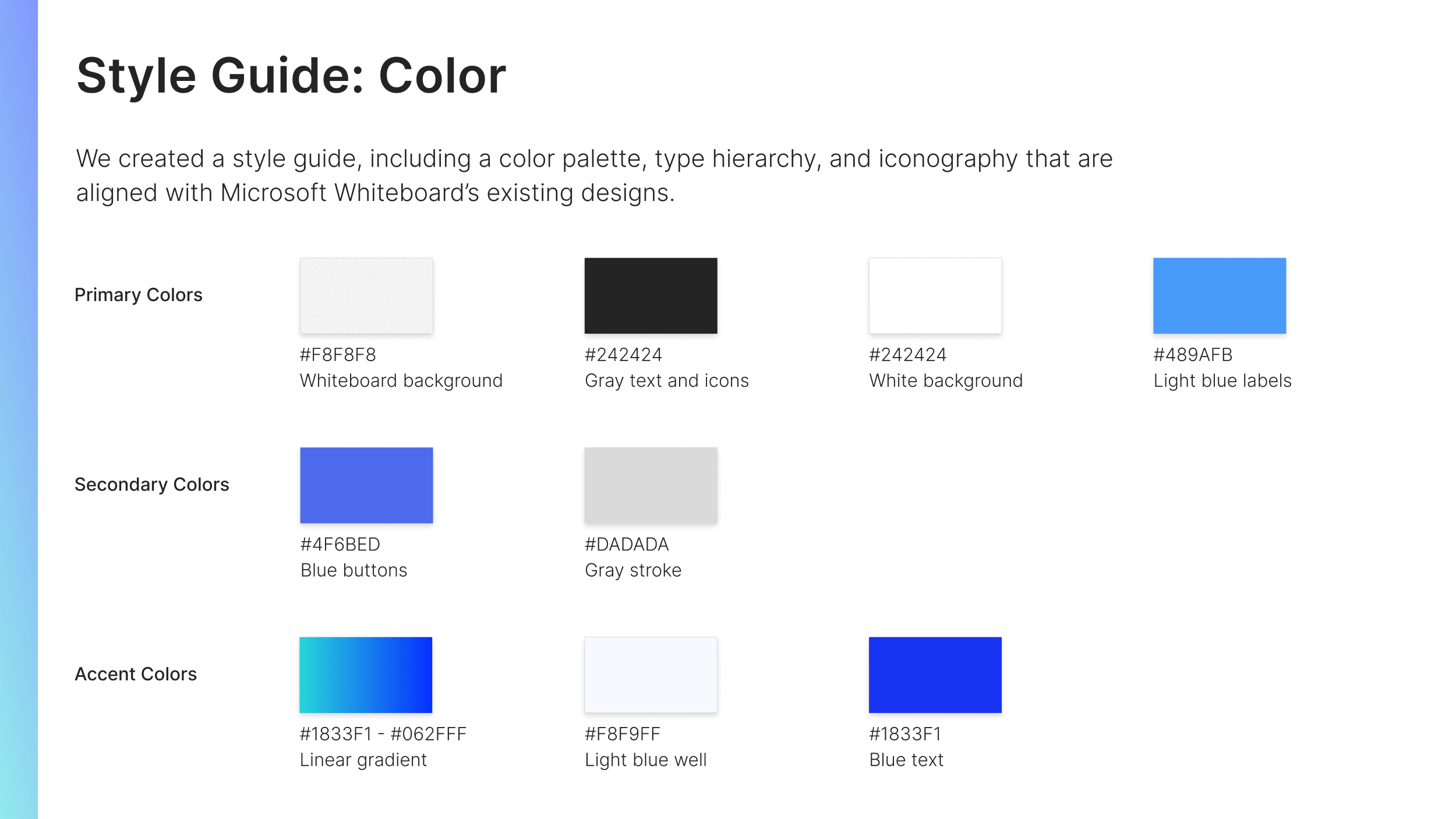 ✱ We created a style guide, including a color palette, type hierarchy, and iconography that are aligned with Microsoft Whiteboard’s existing designs.