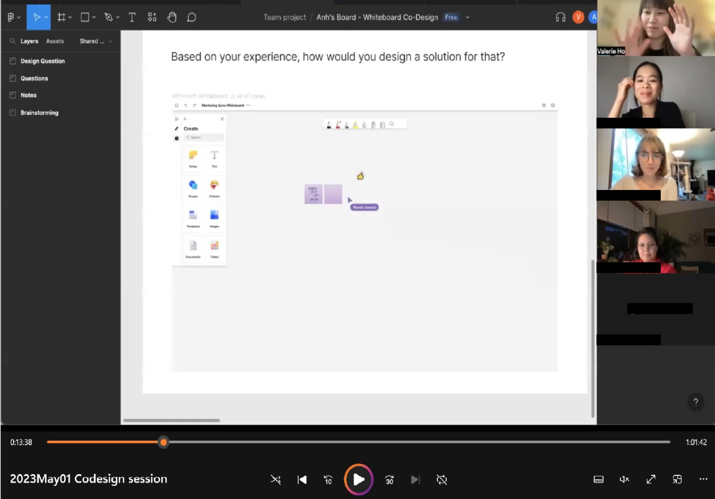As part of a two quarter-long (20 weeks) Master’s capstone in Human Centered Design, my team of four students was sponsored by Microsoft to transform and improve remote brainstorming sessions using the MS Whiteboard application. I served as my team’s lead UX Designer. While I participated in every part of the project, including research and testing, I led the literature review, analysis and synthesis of qualitative user research data and worked with another teammate to design our interactive Figma prototype.