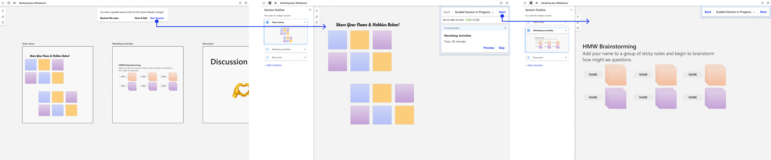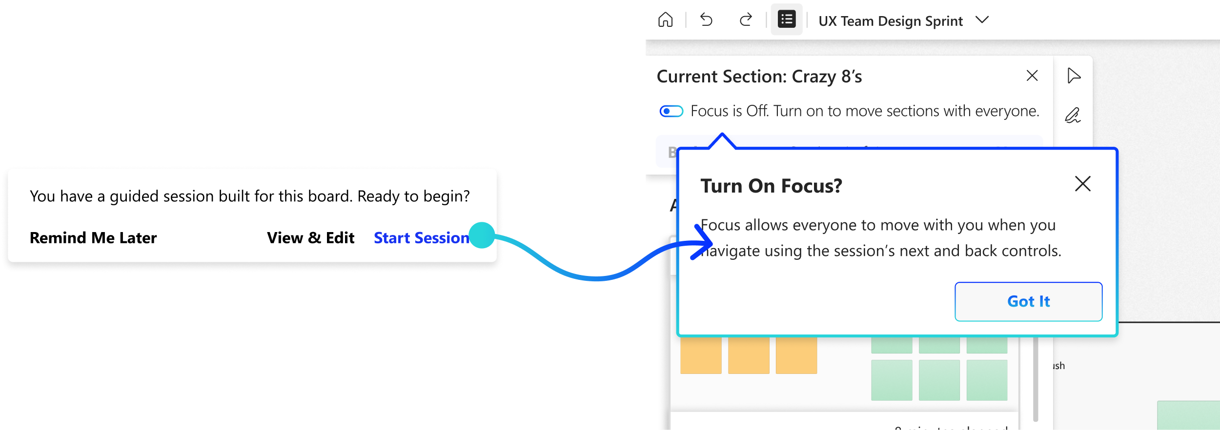 There was a major disconnect between the “Start Session” modal and its purpose – Facilitators liked that participants were guided around, but didn’t understand how to get that started. We renamed the “Start Session” feature to “Focus Mode” to clarify its purpose of capturing participants’ attention.