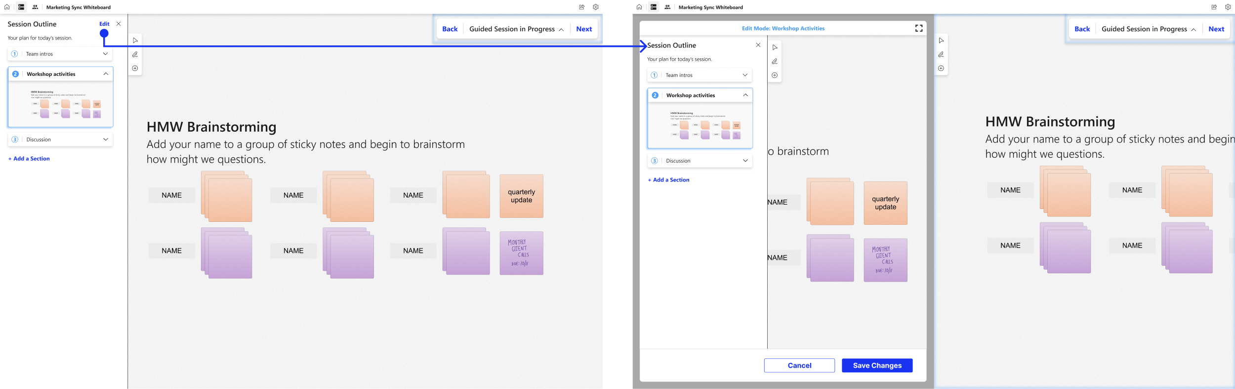 This scenario and use case of the Outline is irrelevant, so we removed “Edit Mode”. By doing so, we optimized the facilitator’s viewing and editing capability by matching their mental models of doing the same in other Whiteboard tools.