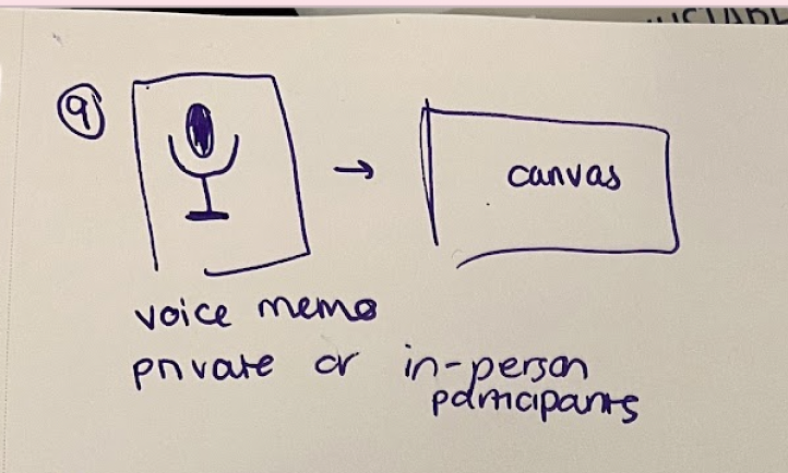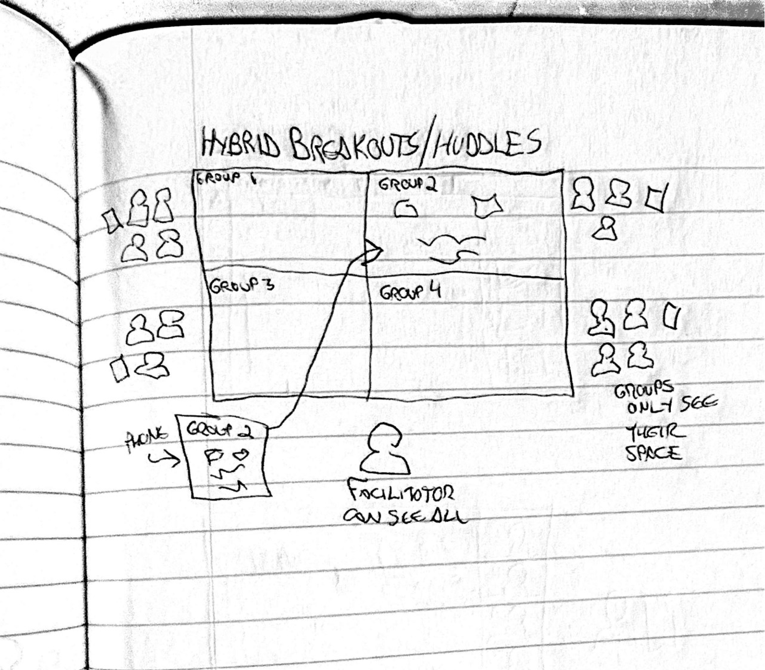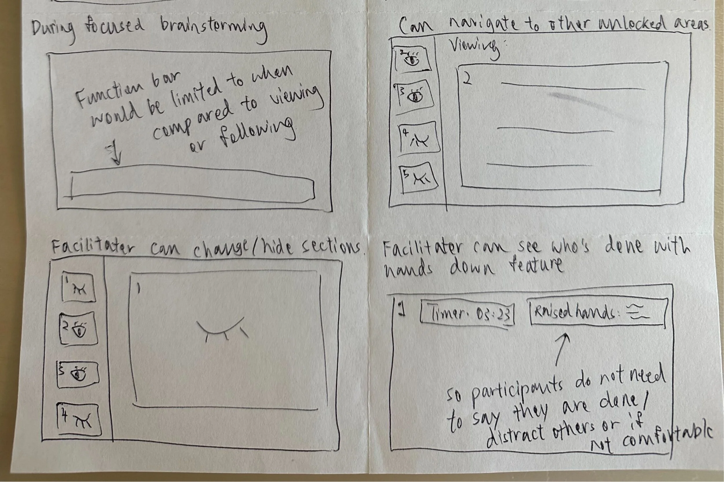 We continued to iterate on the outline concept. However, concerns with participant monitoring and privacy led us to question the validity of the private workspaces idea. At this point, we needed to address our problem statement/design question by hosting a co-design session with both facilitators and participants to solicit their help.