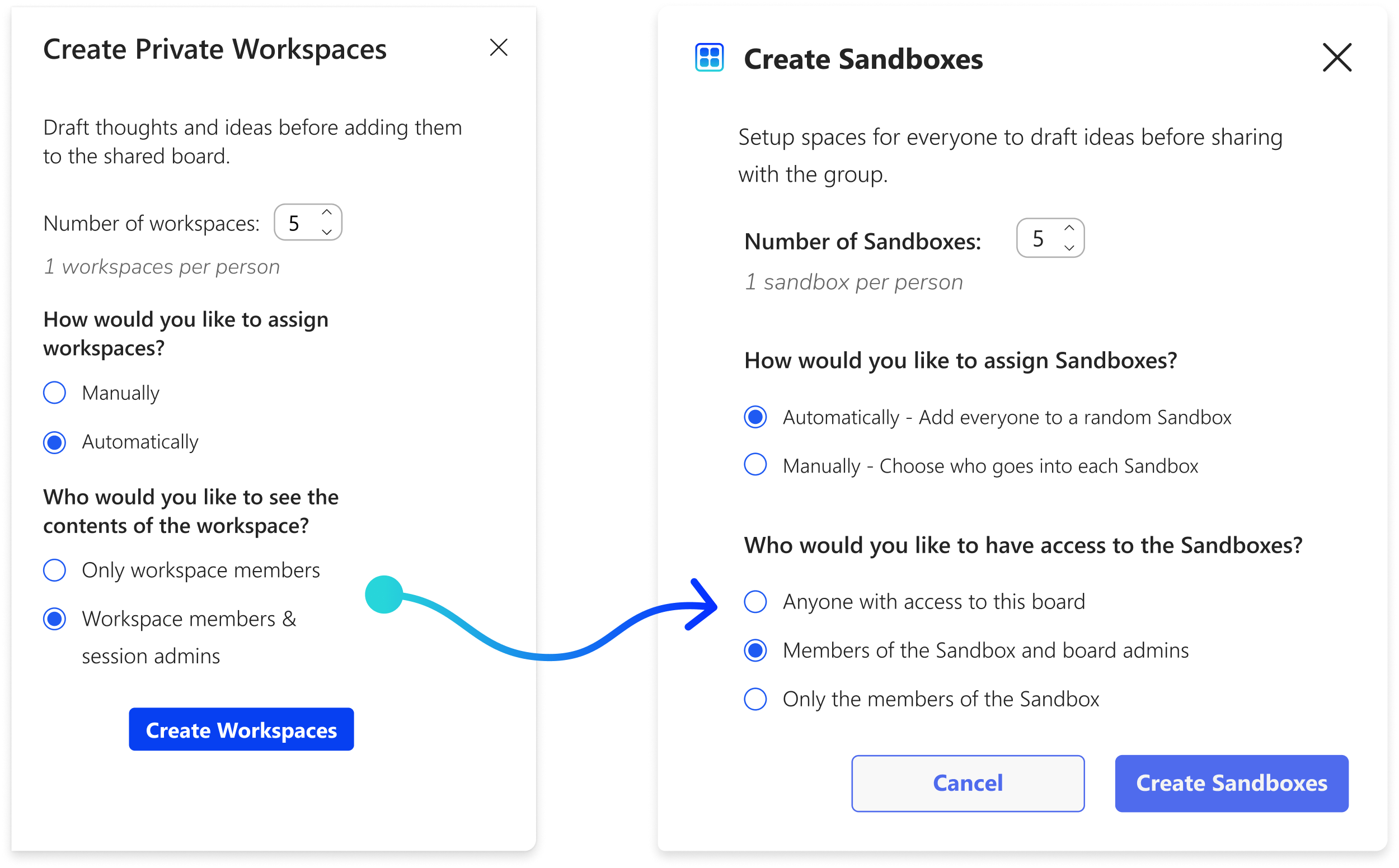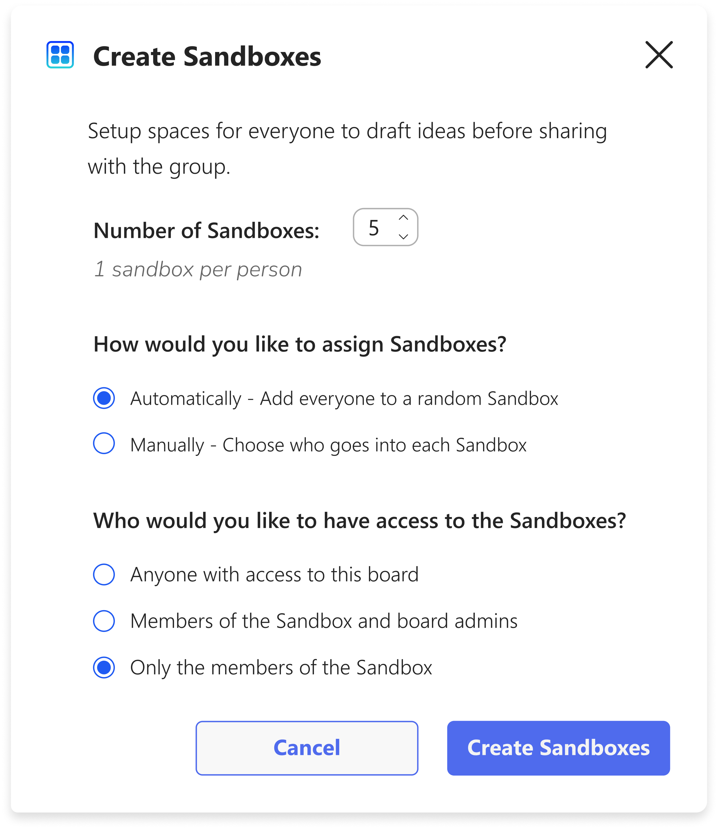 Access to Sandboxes: Sandboxes can be viewable to participants only, to participants and the facilitator, or to everyone on the board.