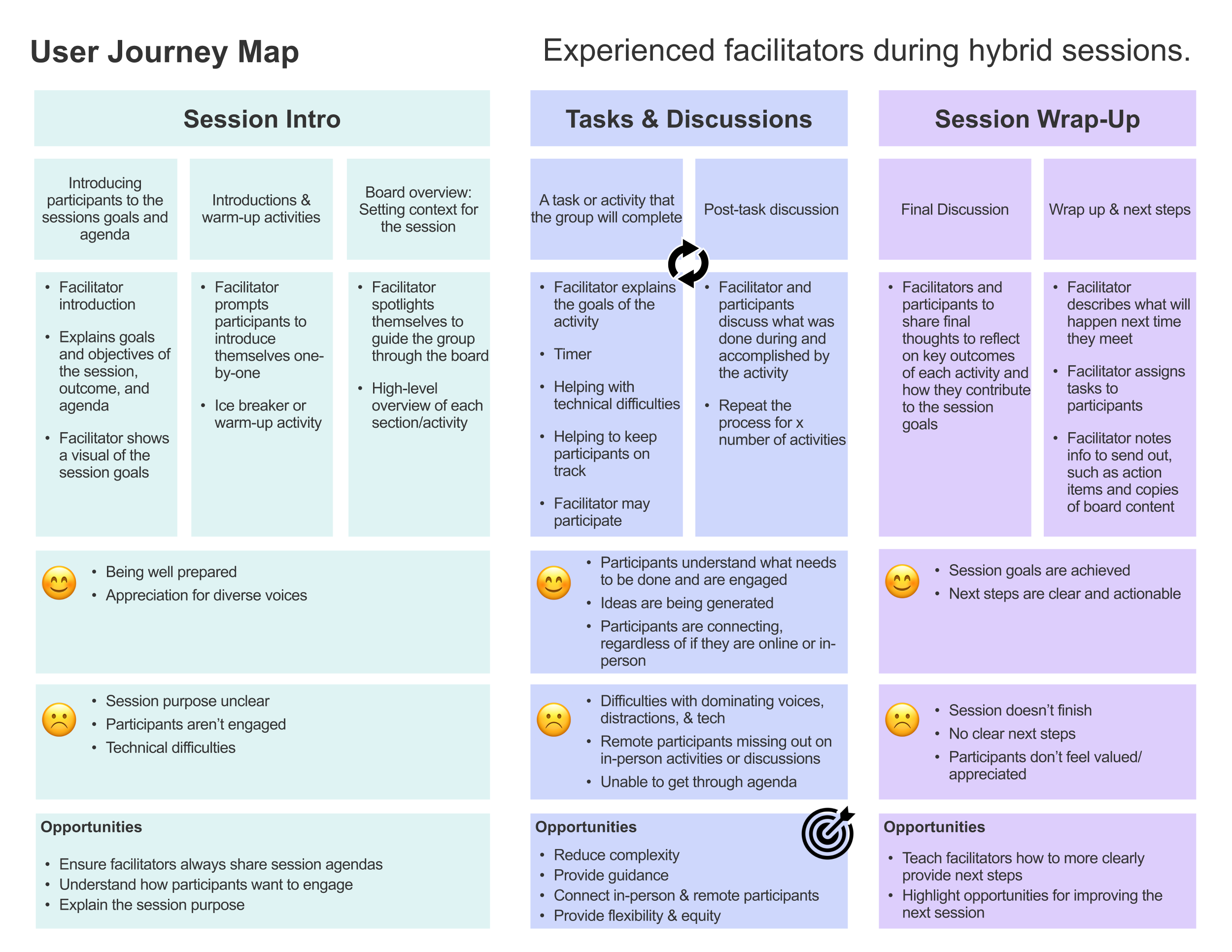 We then developed a user journey map of experienced facilitators leading a hybrid brainstorming session. This process allowed us to focus our project on tackling user pain points that occur during the meat of the brainstorming session: Tasks and discussion.