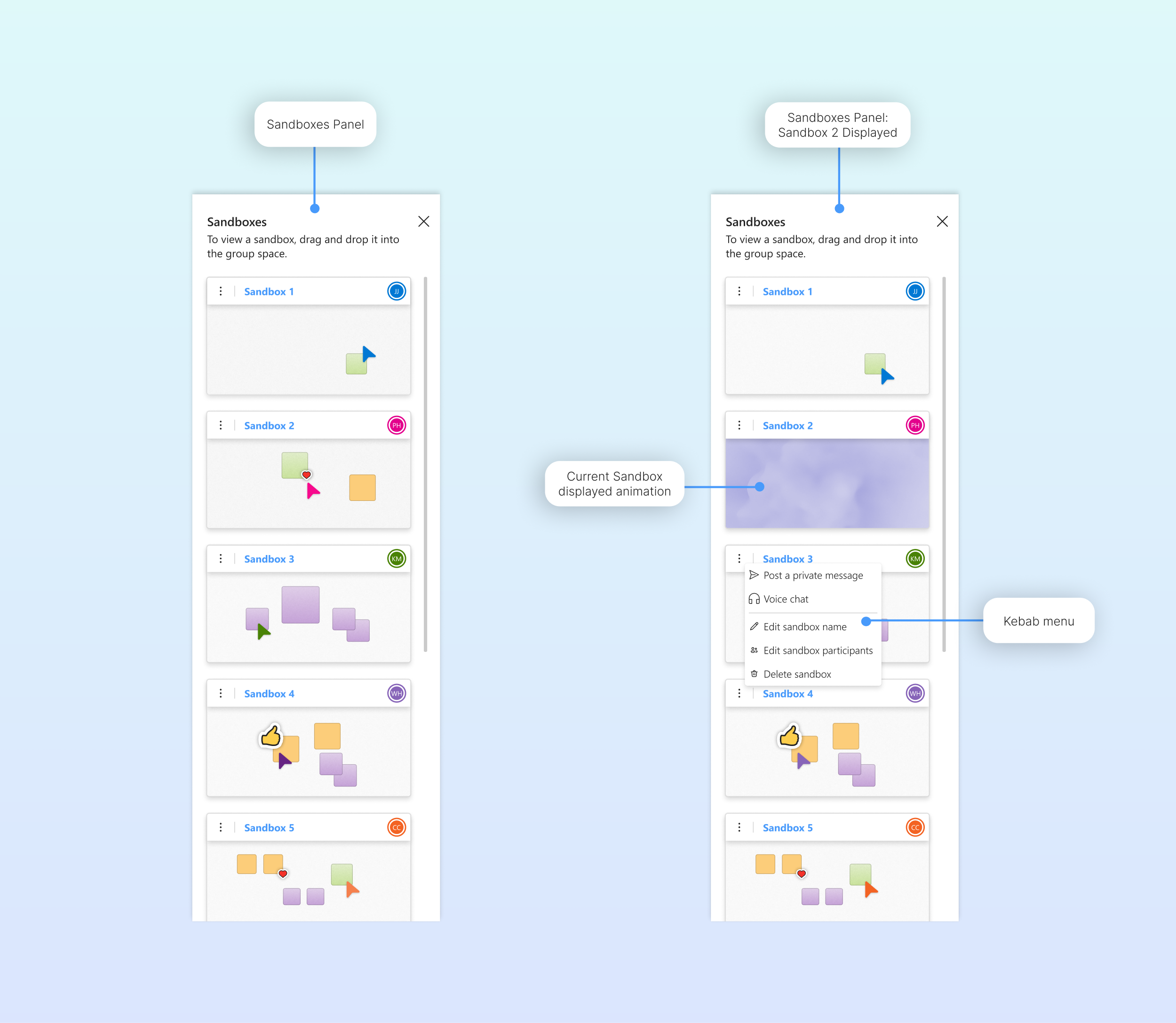 The Sandboxes panel includes a list of all Sandboxes, with a preview box that can show a live feed of the participants’ cursor and activity. If the privacy of the Sandbox is set to participants only, the preview box is not visible. Additional functions can be accessed via the kebab menu, including renaming the Sandbox, edit participants, and delete the Sandbox.