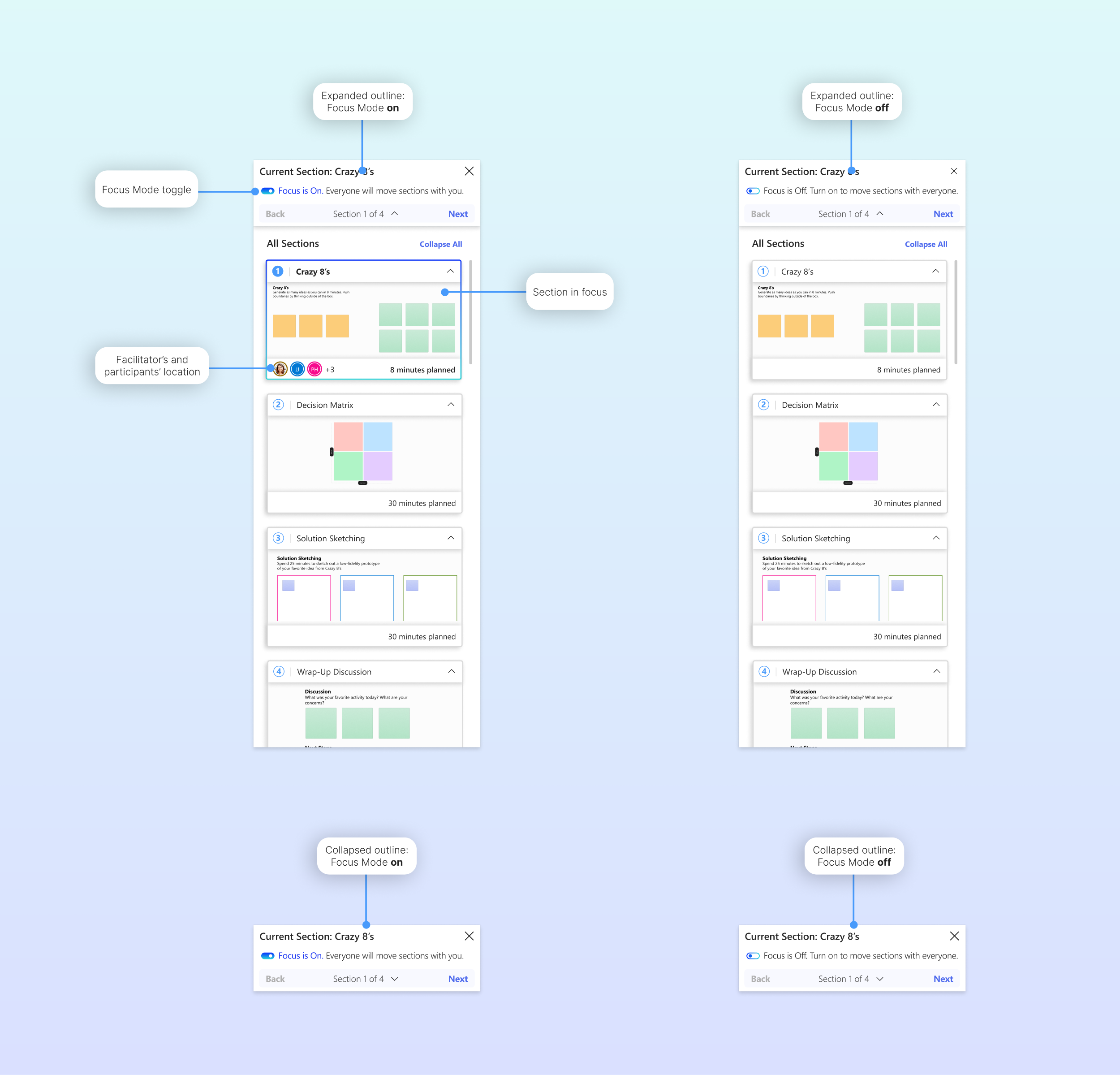 We removed the modal and incorporated “Focus Mode” in the outline panel as the facilitator is We also added colors and indicators to help the facilitator understand whether or not focus mode is turned on, and where the participants are on the whiteboard using the outline to introduce the board and activities planned to the participants.
